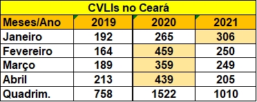 O Ceará superou a barreira dos mil assassinatos em 2021. Dados da Secretaria da Segurança Pública e Defesa Social (SSPDS) revelam que até o último dia 24, 1.010 crimes violentos letais intencionais (CVLIs) foram registrados no Estado. Abril contabiliza, até o momento, 205 registros. Duas chacinas aconteceram neste mês: a primeira, no município de Caucaia, Região Metropolitana de Fortaleza (RMF), quando quatro pessoas foram executadas; e a segunda, no bairro do Barroso, em Fortaleza, em que cinco pessoas foram mortas.