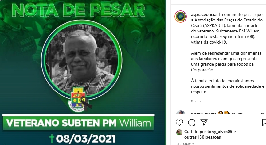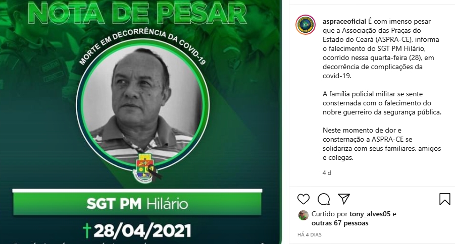 Somente este ano, a Aspra publicou 72 notas de pesar de policiais militares da ativa e da reserva em suas redes sociais. A associação é uma das poucas entidades de assistência a militares que chamam atenção para a letalidade da doença. Desde 8 de março, as postagens no Instagram começaram a vir com a seguinte inscrição “morte em decorrência da Covid-19”. A primeira nota de pesar contendo essa informação refere-se ao subtenente PM William Bandeira Barros, de 62 anos. A nota mais recente é do dia 28 de abril e faz menção ao sargento PM Luiz Hilário Filho, de 65 anos. Até o momento, 17 policiais militares, da ativa e da reserva, tiveram a causa da morte identificada expressamente como Covid-19 nas publicações.