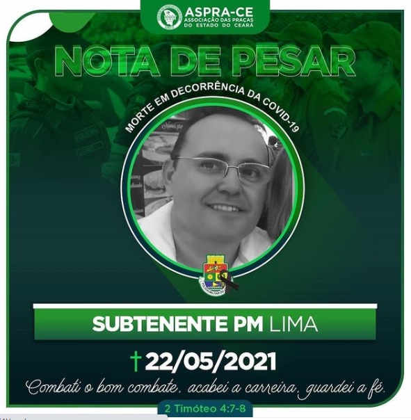 O Subtenente PM Francisco Holanda de Lima, de 50 anos, é a vítima mais recente do Coronavírus. O militar ingressou na corporação em 8 de agosto de 1994 e, atualmente, estava lotado na 2ª Companhia do 9º Batalhão Policial Militar.