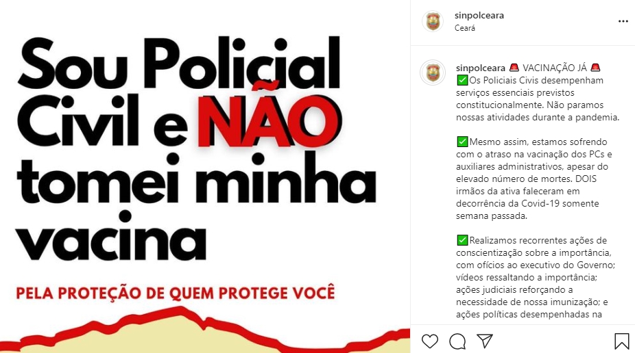 Na semana passada, o Sinpol fez uma cobrança pública sobre uma suposta demora no processo de vacinação dos policiais civis: “Estamos sofrendo com o atraso na vacinação dos PCs e auxiliares administrativos, apesar do elevado número de mortes. DOIS irmãos da ativa faleceram em decorrência da Covid-19 somente semana passada”, afirma a nota.