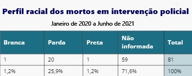 As informações sobre letalidade policial disponibilizadas, contudo, apresentam subnotificação em relação à raça das vítimas: 71,6% das mortes por intervenção policial não possuem identificação racial. Do total de 81 pessoas mortas pela polícia, somente 22 tiveram a indicação da cor da pele: 20 foram classificadas como pardas (25,9%), uma como preta (1,2%) e outra como branca (1,2%). Segundo os números oficiais, a mesma quantidade de homens brancos e negros foram mortos pela polícia em Fortaleza no período.