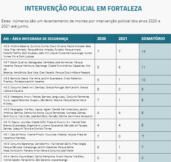A Área Integrada de Segurança 6 (AIS 6), que contempla bairros com perfis socioeconômicos diversos como Antônio Bezerra, Parquelândia, Bonsucesso e Henrique Jorge, foi a região que mais concentrou casos de letalidade policial no período abrangido pelo levantamento: foram sete mortes por intervenção policial em todo 2020 e sete mortes por intervenção policial nos seis primeiros meses de 2021.