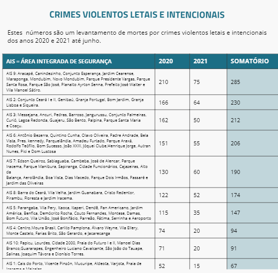A Área Integrada de Segurança 9, que contempla bairros como Mondubim, José Walter, Planalto Ayrton Senna e Canindezinho, registra o maior número de CVLIs da capital cearense, no período entre janeiro de 2020 e junho de 2021. Foram 210 homicídios em 2020 e 75 de janeiro a junho deste ano. Dentre as 10 áreas de segurança que integram Fortaleza, a AIS 9 aparece somente na nona posição quando se trata de letalidade policial, com sete ocorrências.