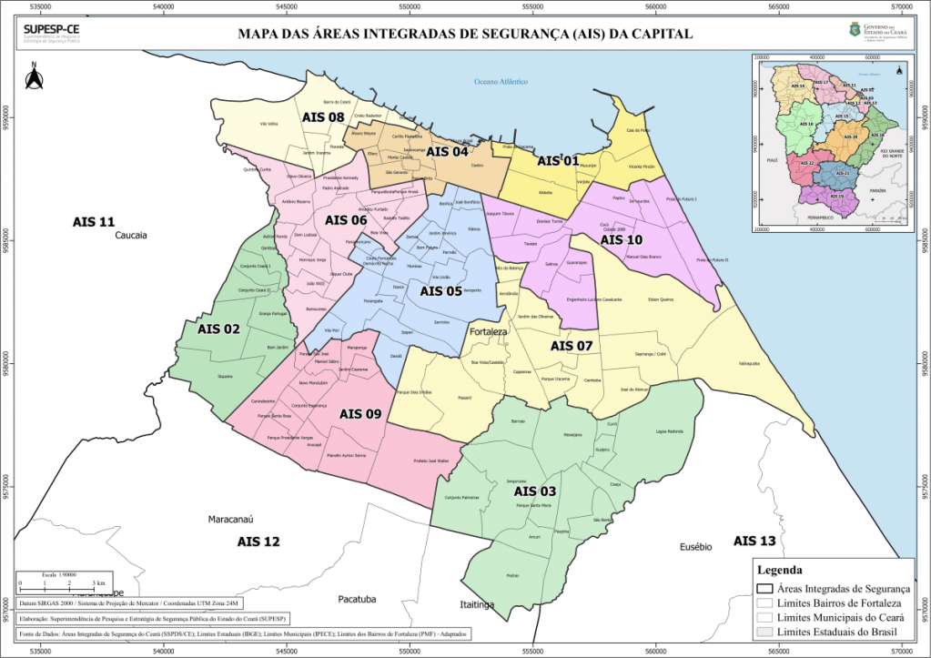 Como as vítimas da violência institucional se distribuem territorialmente na capital cearense? Para compreender esse fenômeno, é preciso ter em mente que o estado do Ceará é dividido em áreas integradas de segurança (AIS), unidades administrativas cuja coordenação cabe a um órgão de gestão compartilhada formado por um comandante da PM, um comandante do Corpo de Bombeiros e um delegado da Polícia Civil. Fortaleza é dividida em 10 AIS, com cada uma delas compreendendo diversos bairros, como pode ser visto no mapa abaixo.