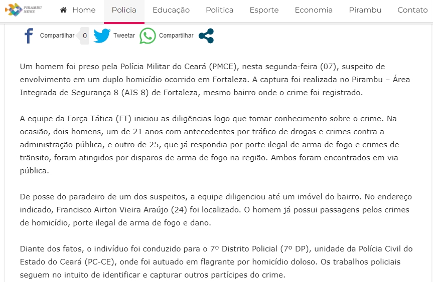O site Pirambu News retratava a realidade do bairro, informando sobre o dia a dia da comunidade e publicando notícias relacionadas à segurança pública. De acordo com o perfil do portal no Instagram, tratava-se de “um projeto 100% voltado para estudantes de jornalismo e jornalistas formados das periferias”. As matérias relativas à criminalidade local traziam indicação de números de telefone dos órgãos de segurança para que a população pudesse denunciar a ação de criminosos, como o 181, o (85) 3101.0181, do Whatsapp, e o (85) 3257.4807, da Departamento de Homicídios e Proteção à Pessoa (DHPP), também.