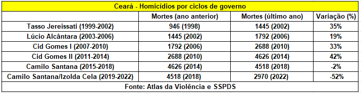 Em janeiro de 2019, escrevi uma coluna em que destacava um fato inédito no ciclo de governadores do Ceará das duas últimas décadas: pela primeira vez um governante encerrava seu mandato com números mais baixos de assassinatos na comparação com o ano anterior ao que assumiu. O feito coube a Camilo Santana (PT) que, à época, findou sua primeira temporada à frente do cargo com uma redução de 2% nos crimes violentos letais intencionais (CVLI), embora o patamar fosse bastante elevado, ou seja, acima dos quatro mil homicídios.