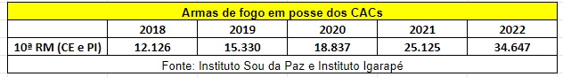O registro dos armamentos é feito pela 10ª Região Militar, que abrange o Ceará e o Piauí. Por essa razão, não é possível obter o resultado individualizado. Em 2018, havia 12.126 armas de fogos em poder dos CACs nesses dois estados. Em 2022, esse número saltou para 34.647.