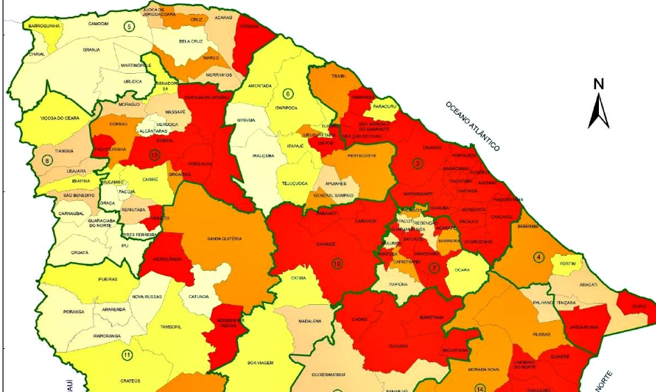 Entre 2019 e 2020, o número de municípios acima da faixa da taxa de 30,01 homicídios para cada 100 mil habitantes cresceram em aproximadamente 107,69%, passando de 39 cidades em 2019 para 81 cidades em 2020. Isto é, em torno de 44% dos 184 municípios cearenses. Esses resultados se refletem no aumento vertiginoso esperado de 79,03% entre 2019-2020 em todo o estado do Ceará.